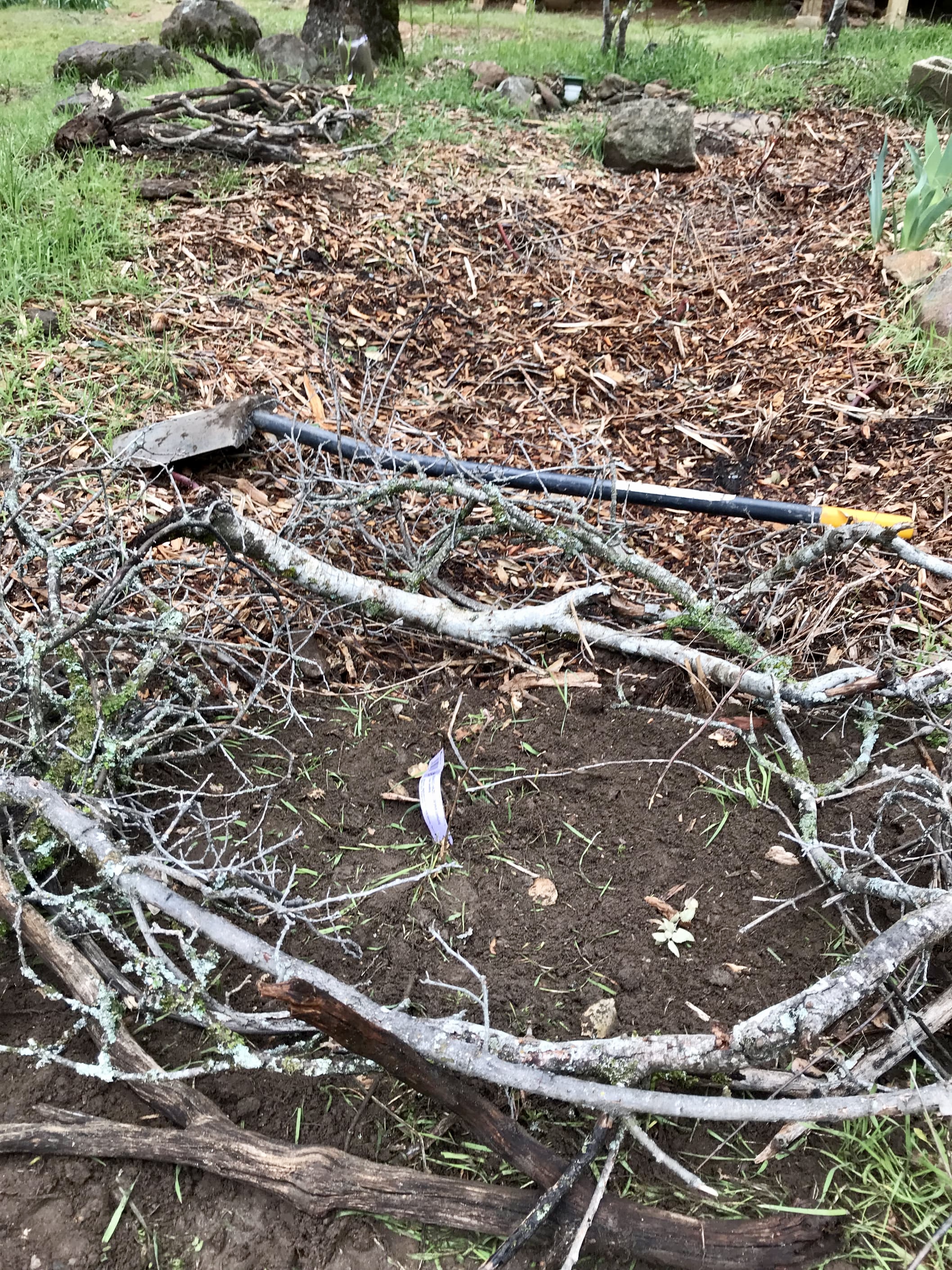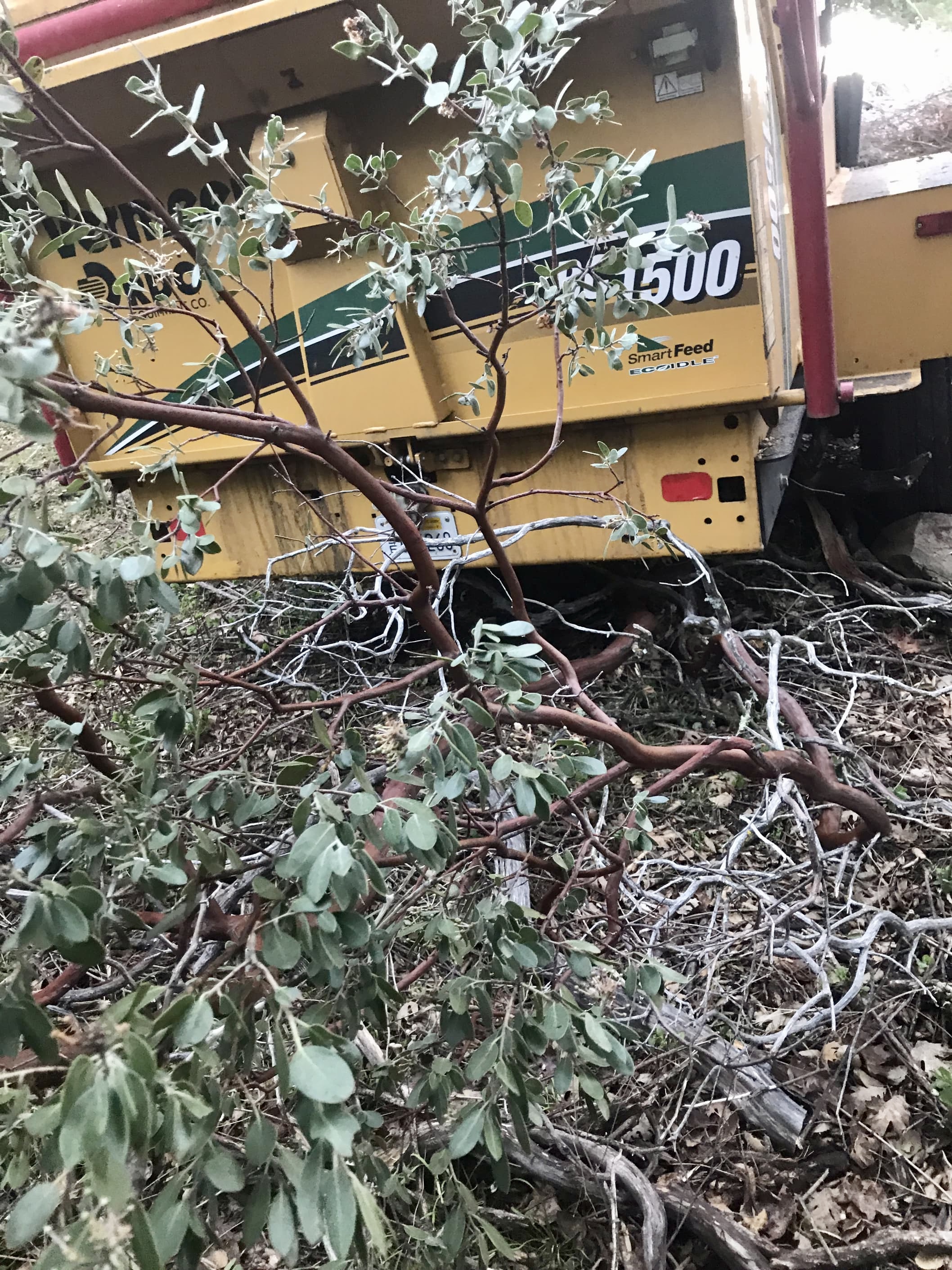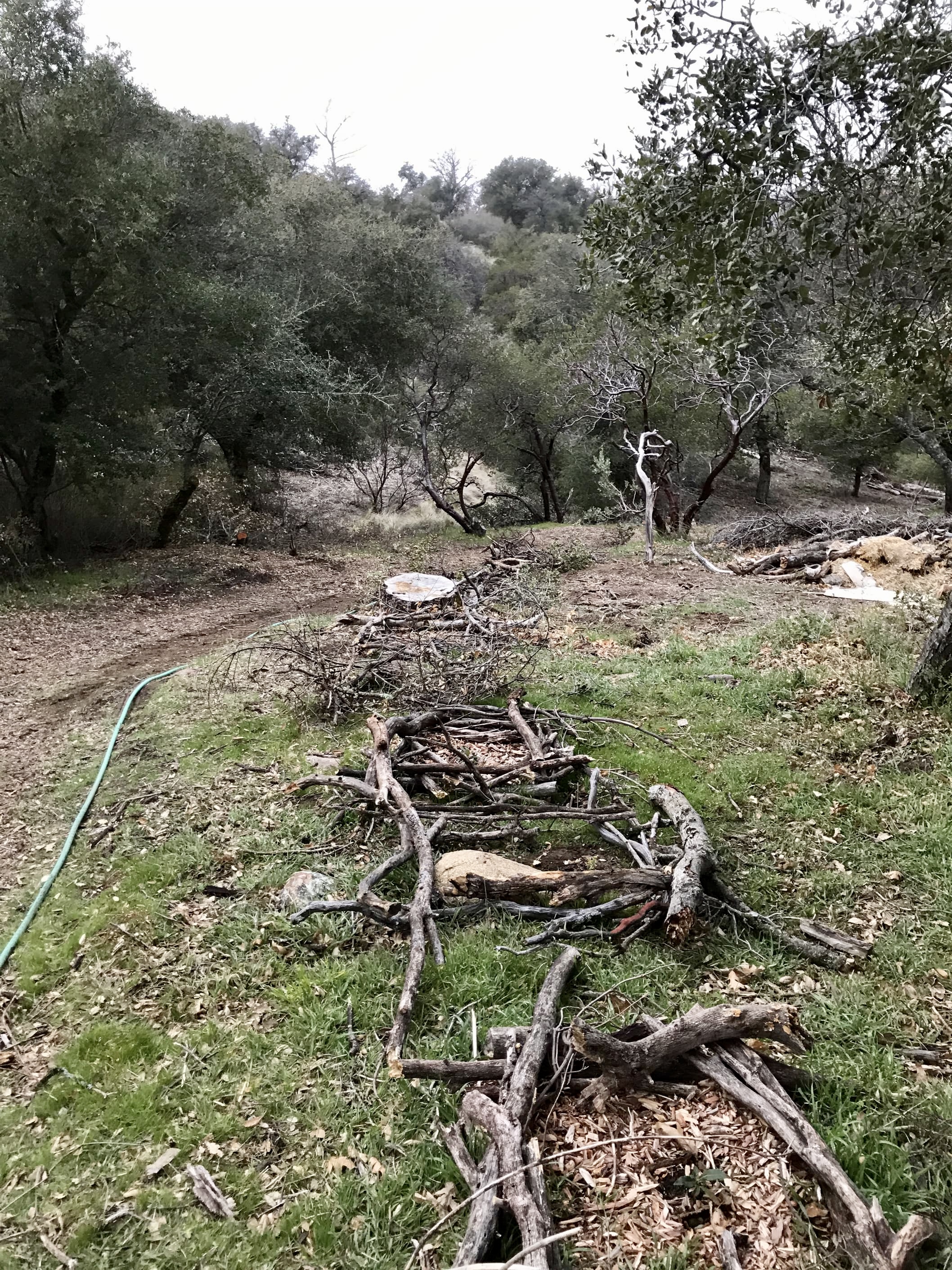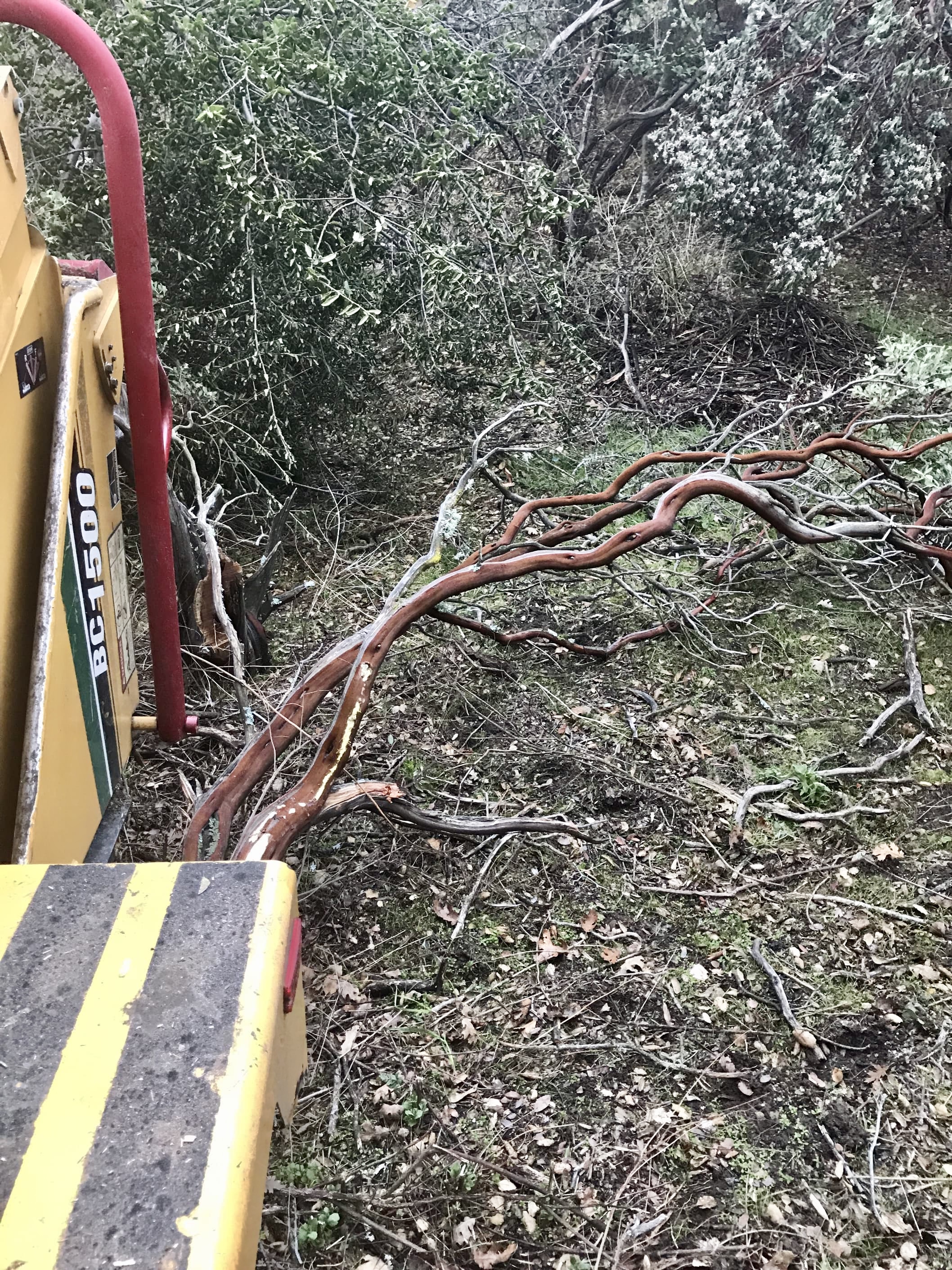 Yesterday the chippers came out again, and it was sprinkling all morning, and of course they got the chipper stuck. They tried to get it out using a small skid steer with no luck, and it crushed a couple manzanita and a small oak. They left it here with the idea of coming back today with a bigger skid steer. It’s a visceral example of how machines can improve a landscape quickly, and destroy it just as fast