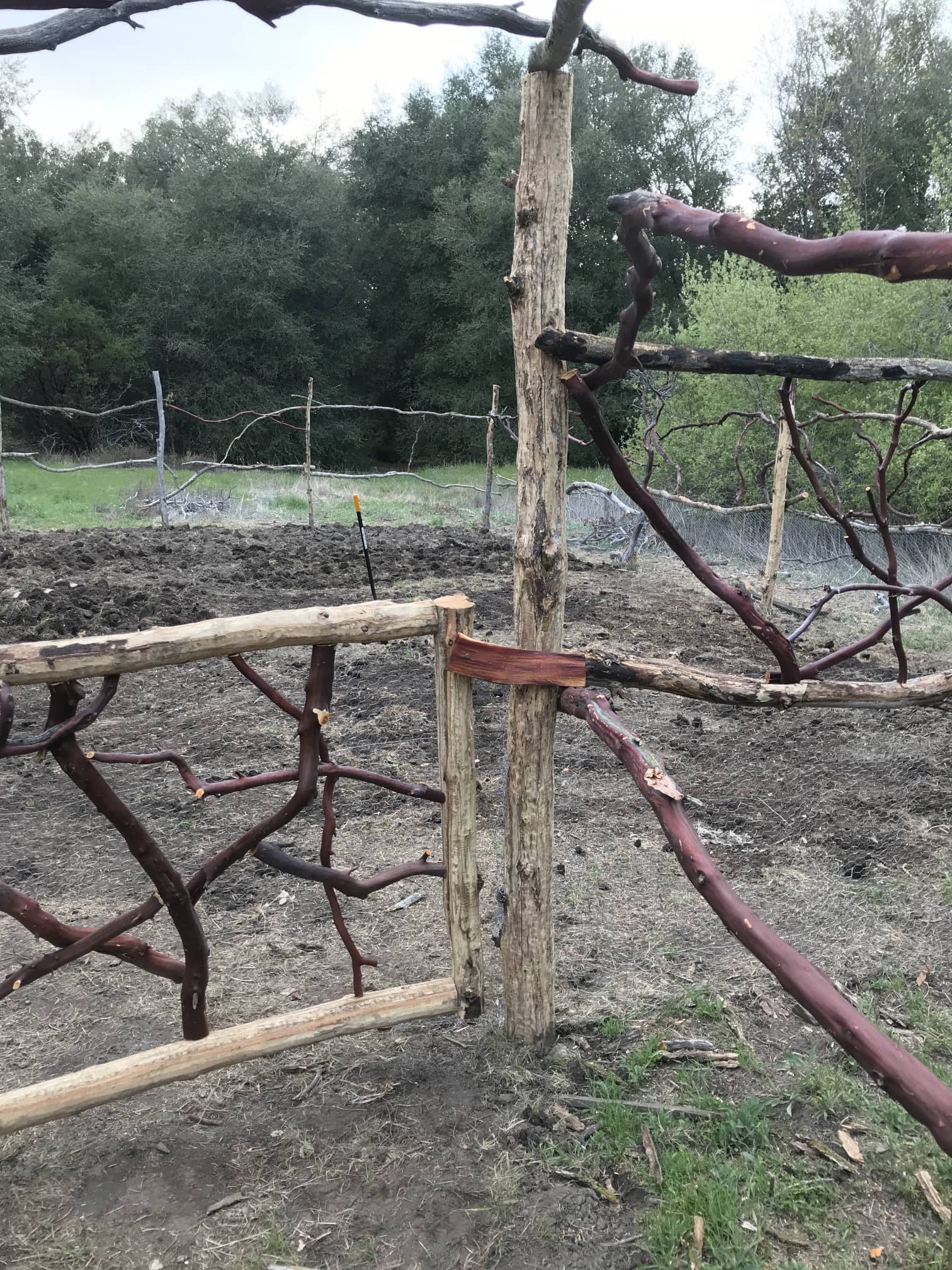 We’ve continued work on the garden -- about halfway through digging the whole thing a foot deep and uprooting the remains of the sod. I also made a latch for the front gate, and I’m slowly adding more manzanita between the cross beams.